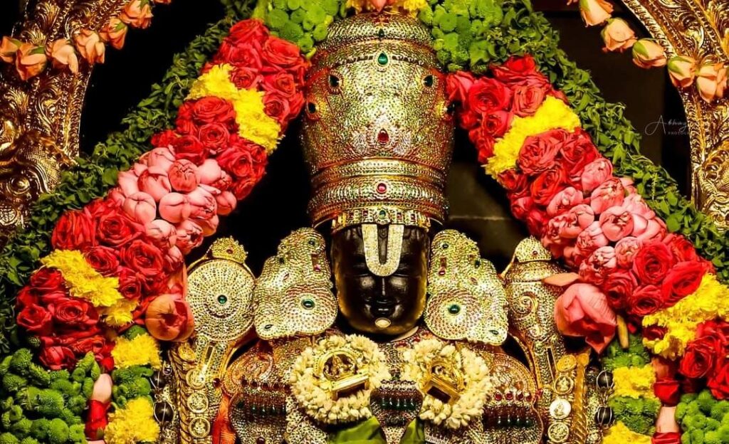 Offering Tulasi leaves and flowers to Lord Venkateswara for divine grace, wealth, and protection from negativity.